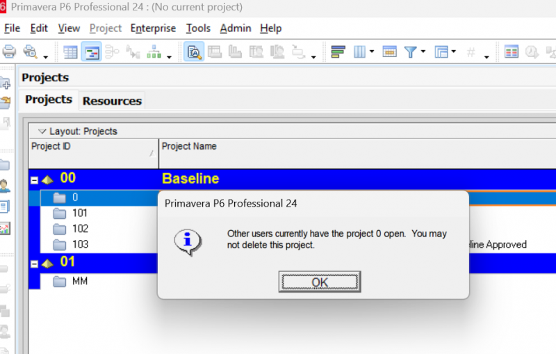 "Other users currently have the project 0 open. You may not delete this project." Hatası